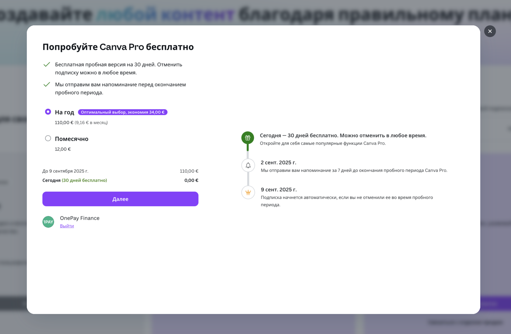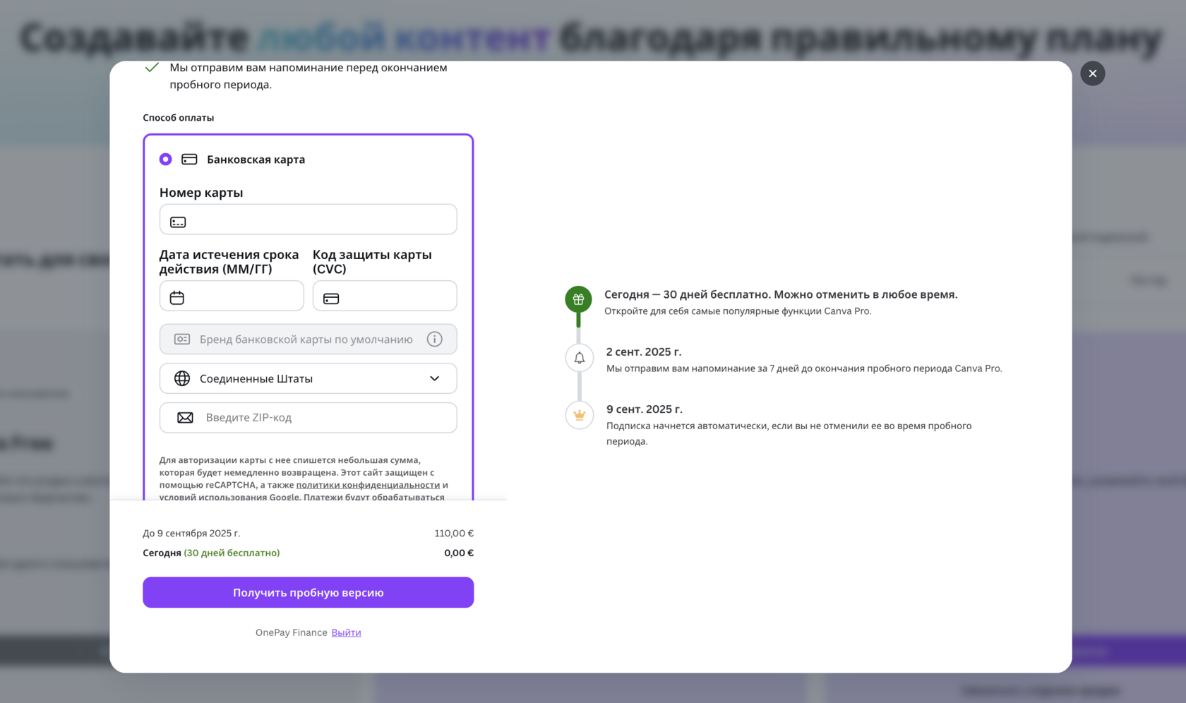 Существует проверенный и рабочий способ обойти ограничения и продолжить пользоваться всеми преимуществами Canva Premium. В этой статье мы пошагово разберем, как оплатить Canva из России с помощью виртуальной карты зарубежного банка от сервиса 1Pay. Процесс несложный и не займет много времени.