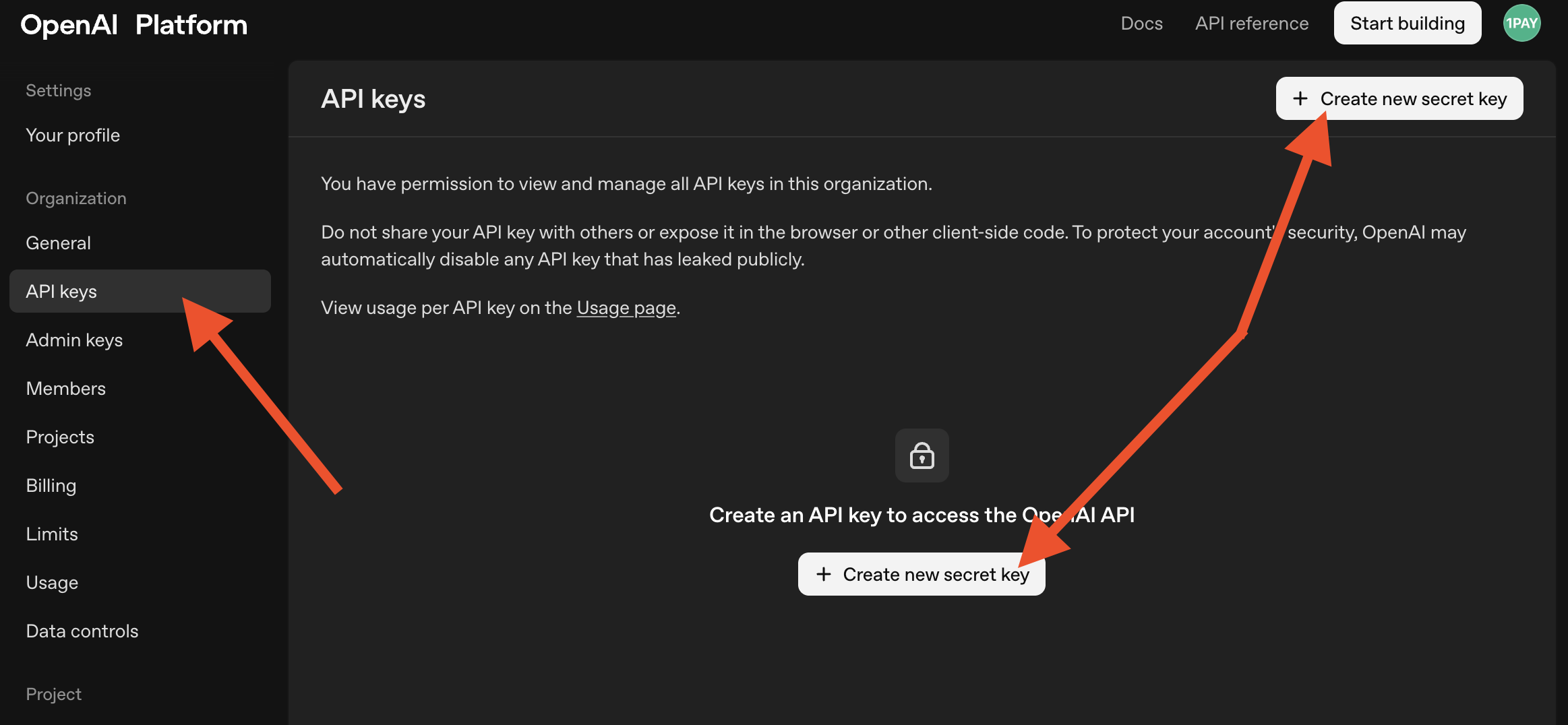 - Перейдите в раздел «API keys» в меню слева.