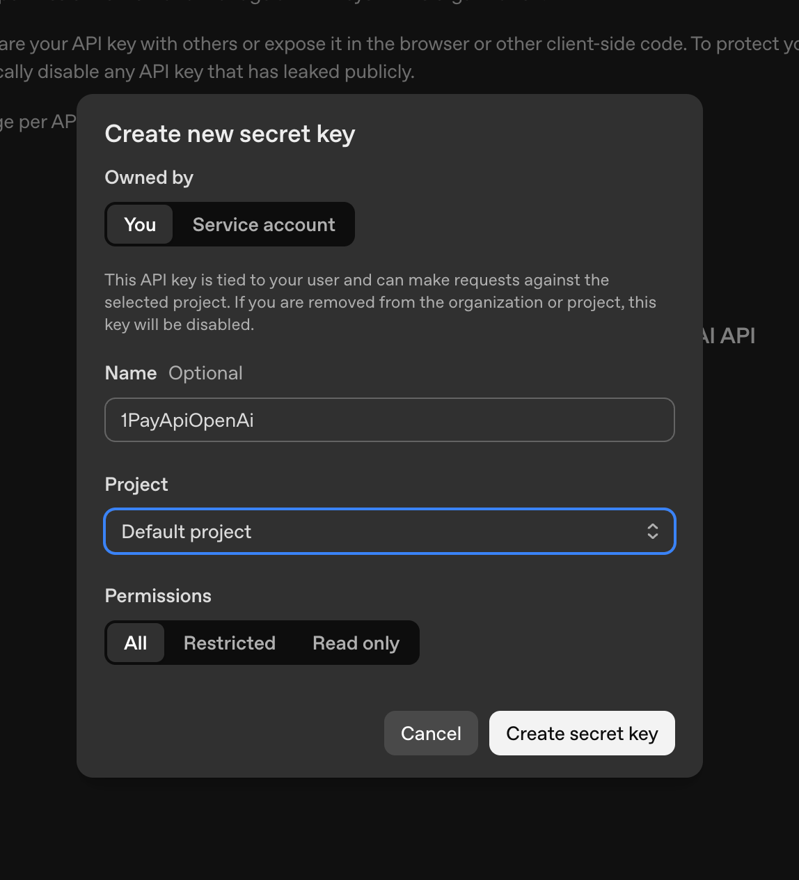 Заполните все поля и нажмите "Create secret key"