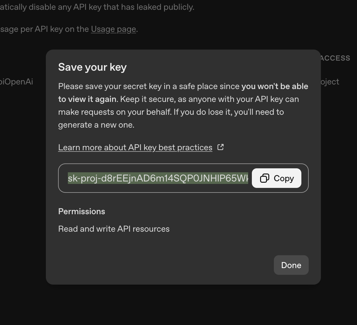 В появившемся окне будет показан ваш новый ключ. Скопируйте его и сохраните в надежном месте. Он отображается только один раз, и если вы его потеряете, придется создавать новый. Никогда не публикуйте свой ключ в открытом доступе.